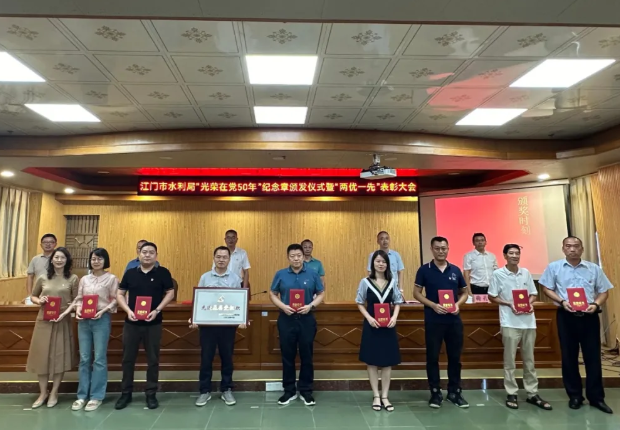 在庆祝中国共产党成立104周年的重要时刻,7月1日,江门市水利局“光荣在党50年”纪念章颁发仪式暨“两优一先”表彰大会召开。会上为“光荣在党50年”老党员颁发了纪念章,对水利系统优秀共产党员、优秀党务工作者及先进基层党组织进行表彰。科禹水利党支部被授予“先进基层党组织”荣誉称号!这是科禹水利党支部连续第三年获此项殊荣。